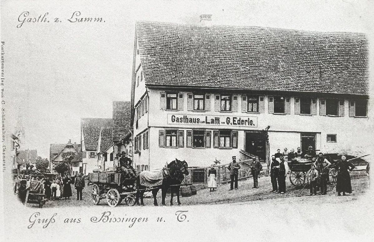 Die Wirtschaft „Lamm“ in Bissingen an der Teck ist eng mit der Familiengeschichte von Gertrude „Trudy“ Ederle, der berühmten Schwimmerin und ersten Frau, die 1926 den Ärmelkanal durchschwamm, verbunden. Trudys Vater, Heinrich (Henry) Ederle, stammte aus Bissingen und war Metzgerssohn im „Lamm“. Im Mai 1892 wanderte er als 16-jähriger Metzgersbub vom „Lamm“ nach New York aus, wo er später eine Familie gründete und zu Wohlstand kam [4].
